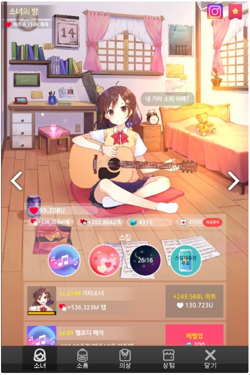 또한, 기타 연주와 더불어 다양한 의상과 여러 소품 아이템으로 소녀와 방을 꾸밀 수 있다고 합니다.