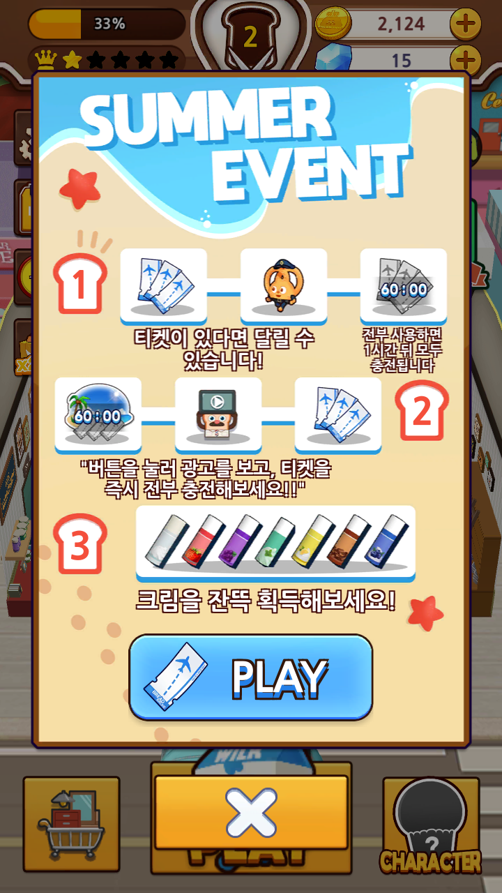 또 하나의 추가된 내용은 여름 이벤트(Summer Event)로 신규 배경의 게임이 등장하였습니다. 도시 또는 마을을 누비던 배경에서 바닷가의 배경이 추가되며 난이도도 조금 증가하였습니다. 게임을 하기 위해서 티켓이 필요하며 처음 제공되는 3개의 티켓을 모두 소모할 시 1시간 뒤에 모두 충전되어 다시 참여가 가능합니다. (광고를 시청하면 즉시 충전됩니다.) 지급되는 아이템은 브레드가 손님들을 꾸미는 데 사용하는 도구들입니다.