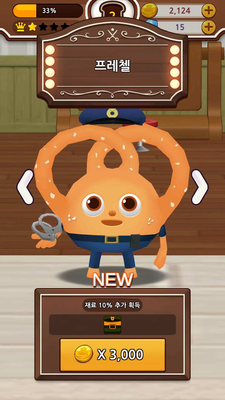 먼저 신규 캐릭터인 프레첼 순경을 선택할 수 있습니다.(코인으로 구매 가능) 모자가 어떻게 올라가 있는지 모르겠지만 애니메이션에서는 머리에 구멍이 뚫려 있는 생김새로 선배에게 무시만 당하다 전화위복으로 당당히 활약하게 되는 에피소드로 등장하는 캐릭터입니다. 신규 NPC의 모습도 보이는군요.