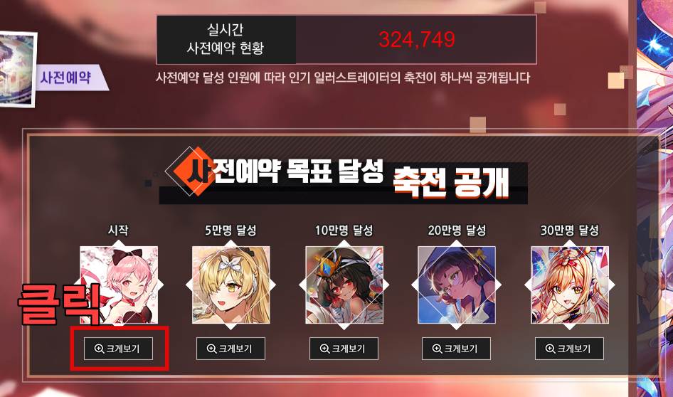 사전 예약자 달성에 따라 축전이 공개되고 있었습니다. 어느덧 30만 명이 넘어섰기 때문에 모든 축전을 확인할 수 있는데요, 그중 맨 앞 캐릭터의 크게 보기 버튼을 클릭하면 네 번째 프리즘을 획득합니다.