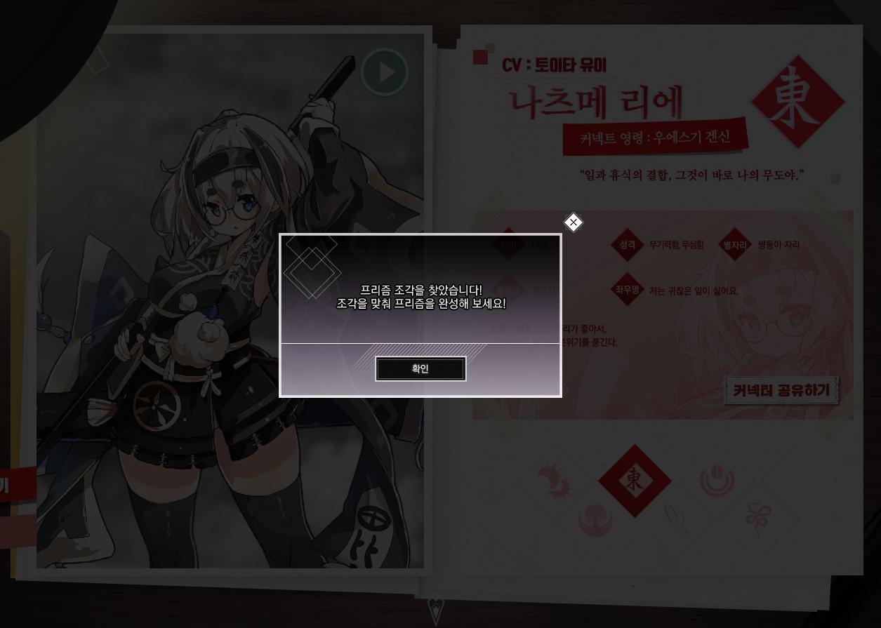 나이트메어, 프리즘, 커넥터 등의 일루전 커넥트 세계관을 볼 수 있습니다. 각 캐릭터들은 여러 집단에 소속되어 있으며 그중, 동양 조직의 나츠메 리에 커넥터를 찾으면 프리즘을 획득하게 됩니다.