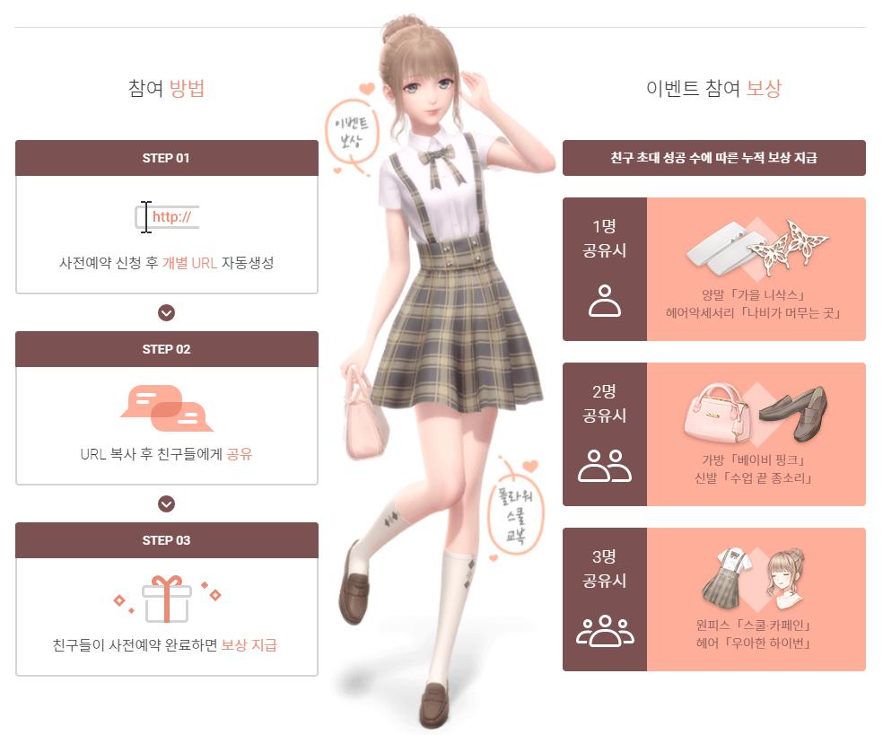 사전예약을 신청하면 개별 URL이 생성되는데요, 복사 후 SNS를 통해 친구에게 공유하여 사전예약까지 완료할 경우 게임 내 코디할 수 있는 아이템이 지급됩니다. 초대 성공 수에 따라 누적 보상이며 최대 3명입니다. 샤이닝 니키의 정식 출시 후 지급된다고 합니다.