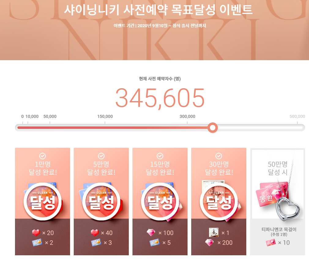 다른 게임들과 마찬가지로 샤이닝 니키도 일정 사전 예약자 수가 채워지면 특별한 혜택이 지급됩니다. 현재 꽤 많은 참여자가 모였습니다. 최종 목표인 50만 명 달성 시 티파니엔코 목걸이와 몽환 10개가 지급됩니다. 응? 그런데 티파니엔코 목걸이는 인 게임 아이템이 아니라 실제 목걸이인가요?