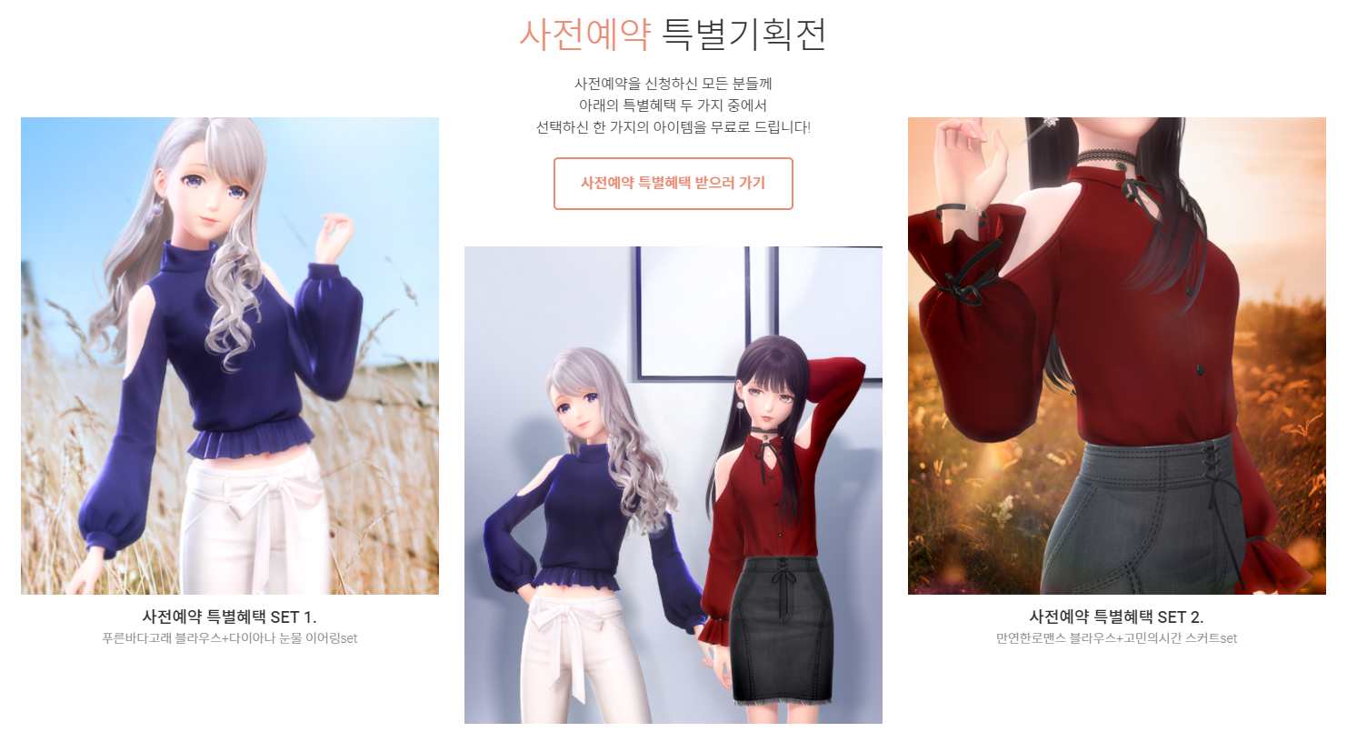 샤이닝 니키의 사전예약을 신청하신 모든 분들께 아래 그림의 set 의상 2가지 중 선택한 한 가지 아이템이 무료로 지급됩니다. 한번 선택 시 변경이 불가능하다고 하니 마음에 드는 아이템을 잘 선택하시길 바랍니다.