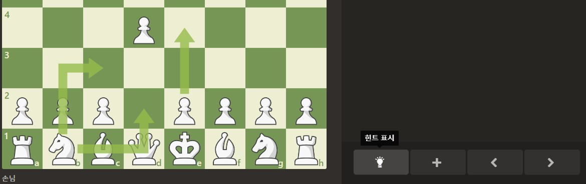 전 체스 초보라 도움 모드를 선택하였습니다. 사진의 좌측을 보시면 플레이어가 이동할 수 있는 방향까지 제시해주는 걸 볼 수 있습니다. 상황에 따라 플레이어의 말이 잡힐 수 있는 상황을 붉은색으로 표시해 주기도 합니다. 오른쪽엔 힌트 버튼과 새로 하기, 이전 동작, 다음 동작 버튼이 나열되어 있습니다. 체스 게임이 워낙 직관적이기 때문에 그리 어렵지 않게 플레이가 가능합니다.