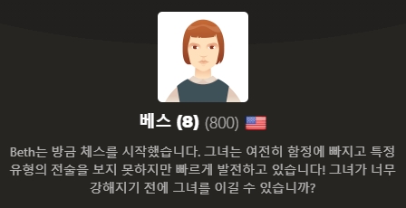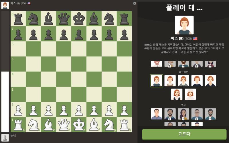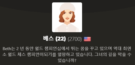 각기 다른 실력을 가진 총 7명의 베스가 플레이어를 기다리고 있습니다. 800 rating을 가진 8살의 베스부터 월드 체스 챔피언인 22세 하먼까지. 무려 2700 rating입니다. 퀸스 갬빗의 베스를 잘 표현하였네요. 본인의 실력에 맞게 베스를 선택합니다.