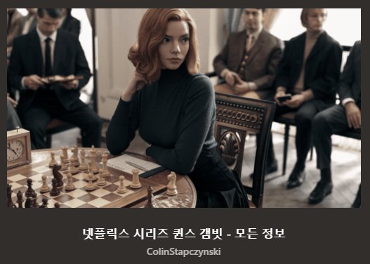 클릭하면 넷플릭스 시리즈인 퀸스 갬빗에 대한 줄거리를 비롯하여 체스 용어, 오프닝, 체스 선수 등 흥미로운 정보를 확인할 수 있습니다.