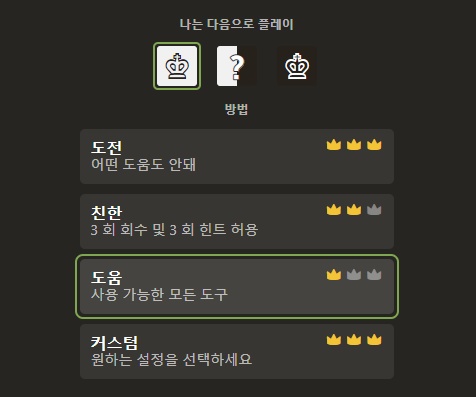 - 친한(Friendly) : 무르기와 힌트를 3번까지 받을 수 있습니다.