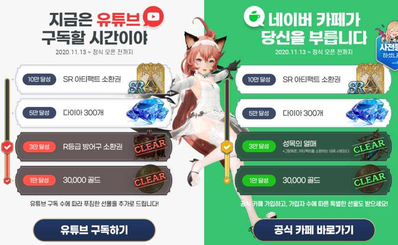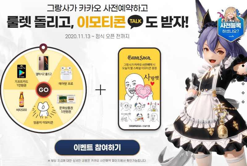 그랑사가의 사전예약은 '20.11.13 ~ 정식 오픈 전까지이며 파이널 CBT 가 곧 시작되는 만큼 평소 관심을 가지고 계신 분들이라면 사전예약을 서두르셔야 할 것 같습니다.