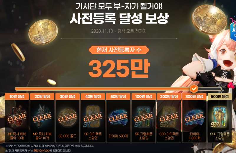 그랑사가의 사전 등록자 수가 이미 300만을 넘긴 지금 500만을 달성할 시 SSR 등급의 그랑 웨폰 소환권이 지급될 예정입니다. 출시 초기 탈도 많았던 '20년 최대 기대작 '원신'의 사전 등록자 수 목표가 300만인걸 감안하면 꽤나 인기몰이 중인 그랑사가 입니다. 300만을 넘긴 시점에서 골드, 다이아, 소환권 등을 이미 확보하였기 때문에 초반 성장에 유리할 것으로 예상되며 500만을 돌파할지 기대가 되는 부분입니다.