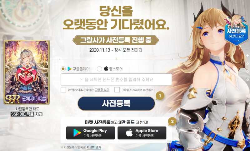 그랑사가 공식 홈페이지에 접속하면 사전등록을 바로 진행할 수 있습니다. 가지고 계신 휴대폰의 OS에 따라 구글 플레이 또는 애플 앱스토어를 선택하고 휴대폰 번호를 입력합니다. 개인정보 수집 동의와 게임 정보 수신동의를 체크하고 사전등록 버튼을 누르면 완료됩니다. 사전 등록만 해도 SSR 등급의 셀리나의 마음 아티팩트가 지급될 예정입니다 각 마켓에 사전 등록할 시 추가 3만 골드도 받을 수 있으니 이용해 보시길 바랍니다.